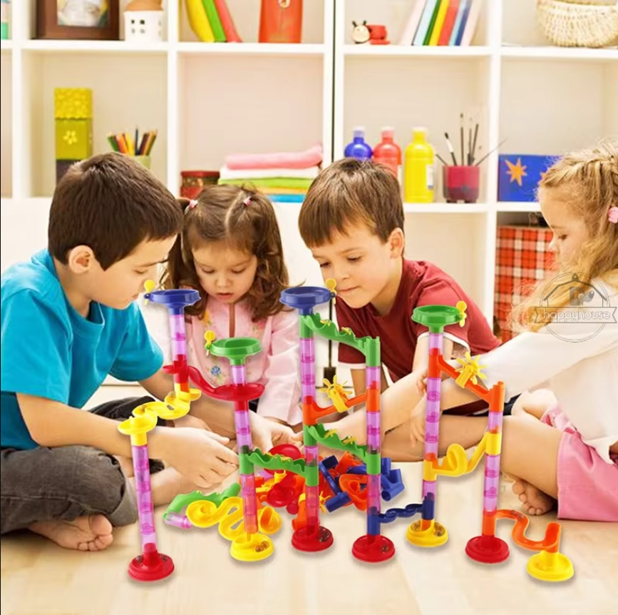 Die Kinder lieben es, die Murmeln durch die bunte Bahn zu rollen. Es ist ein tolles Spielzeug, das ihre Kreativität fördert.